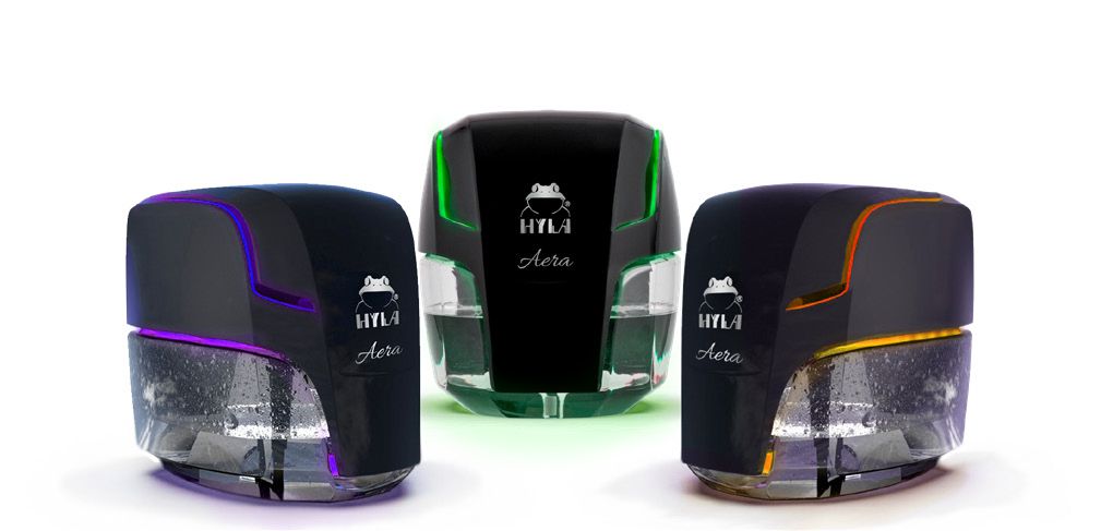 Der AERA Lufterfrischer besteht aus nur zwei Teilen: der Motor-Einheit mit LED-Lichtern und dem Wasserbehälter. Das glänzende schwarze Cover und das zentral platzierte HYLA-Logo machen deutlich, dass es sich um ein neues Produkt von HYLA handelt. Die Neuerung des AERA Lufterfrischers ist die HYLA AERA App, mit der das Gerät über das Smartphone gesteuert werden kann. Die App ermöglicht es dem Nutzer das Gerät zu Aktivieren und aus Millionen von Farben zu wählen oder seinen eigenen Lichteffekt zu kreieren.